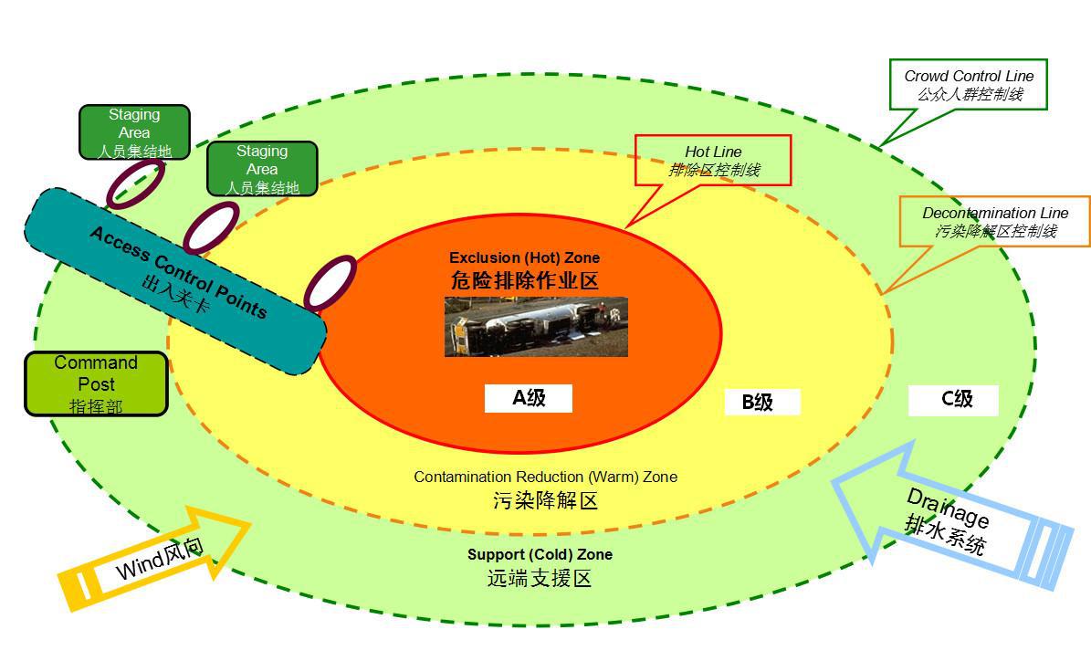 化學(xué)事故一旦發(fā)生,根據(jù)現(xiàn)場(chǎng)情況進(jìn)行緊急部署。根據(jù)現(xiàn)場(chǎng)情況將區(qū)域劃分為A級(jí)危險(xiǎn)排除作業(yè)區(qū)、B級(jí)污染降解區(qū)、C級(jí)遠(yuǎn)端支援區(qū)并設(shè)定排除區(qū)控制線、污染降解區(qū)控制線、公眾人群控制線,在上風(fēng)向方向設(shè)立指揮部、出入通道。